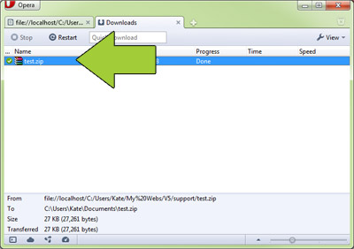 The Downloads Tab will show you what you've downloaded, and you can choose to open it by right clicking if you've a program associated with zips already (such as Winzip, Winrar, or Windows Compressed Folders).
